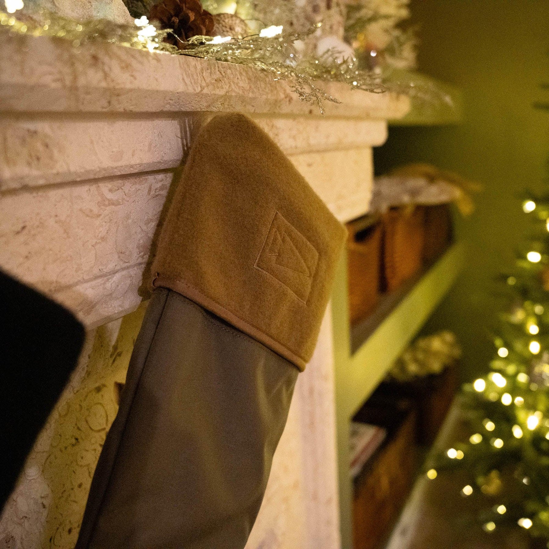 GORUCK tactical stocking hanging on a decorated mantel beside a lit Christmas tree